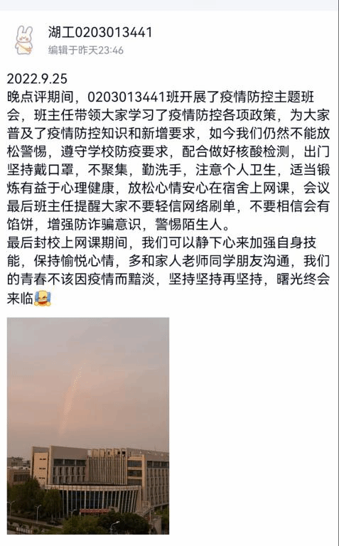 伴随着25日傍晚美丽的夕阳余晖,我院全体班级开展了疫情防控政策学习的主题班会。