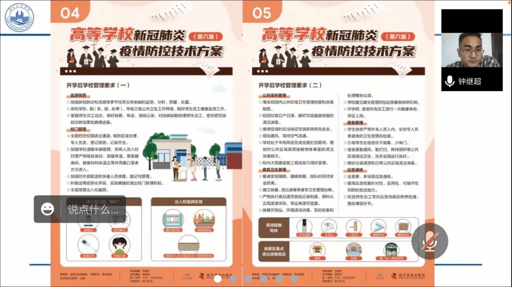班会上,班主任带领同学们认真学习了《新型冠状病毒肺炎防控方案(第九版)》《高等学校疫情防控技术方案(第六版)》,让同学们了解了疫情监测、疫情处置、重点环节防控、组织保障等内容,同时结合学校疫情防控要求,提醒同学们勤洗手、常通风,做好宿舍消杀,外出正确佩戴口罩,错峰就餐,不堂食,按时完成核酸检测等。引导学生严格遵守校园封控管理,“非必要不出校”、“非必要不离孝”,有特殊情况需要出校的,要严格履行学院请假审批程序。同时提醒同学们在与校外快递员、外卖员接触时,做好个人防护和消杀工作。