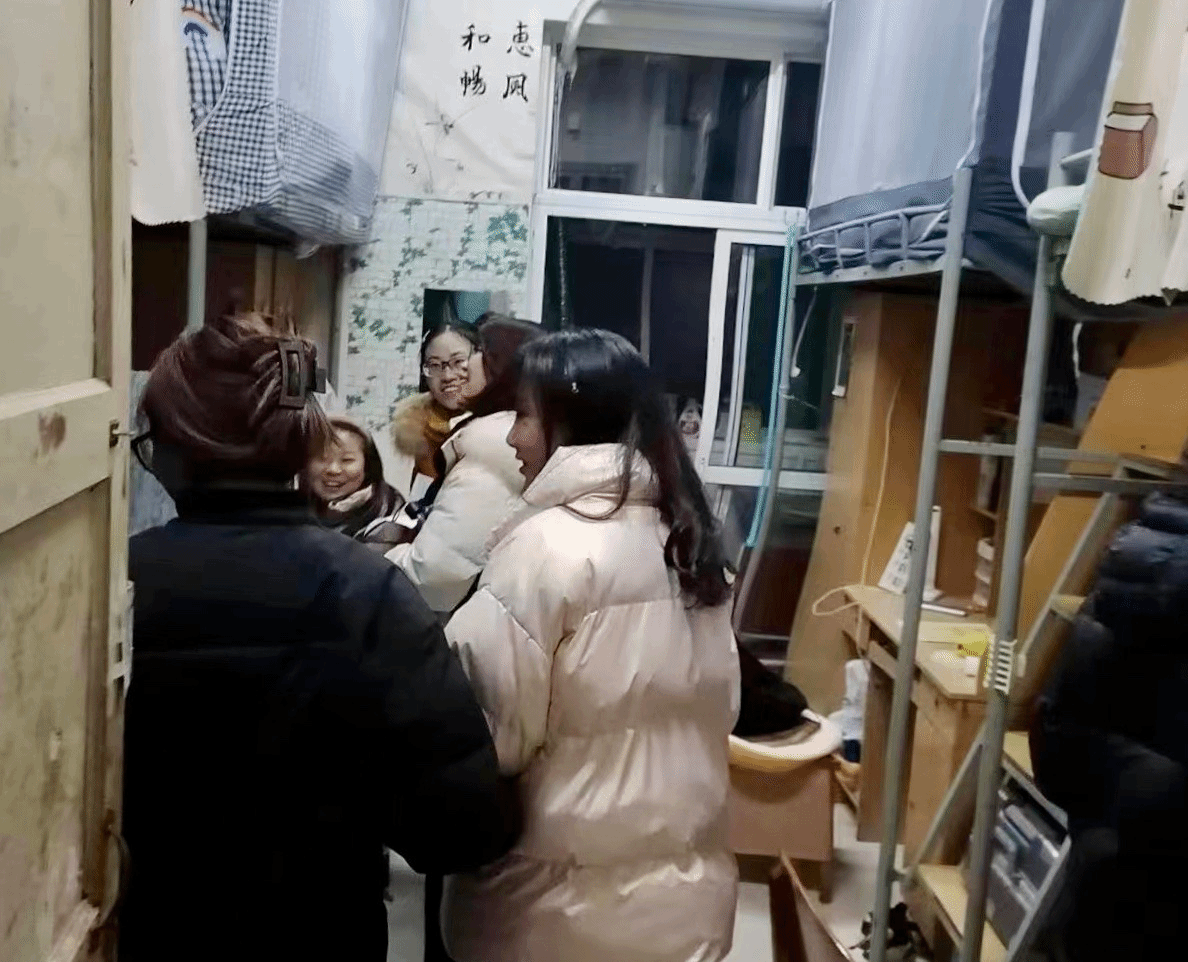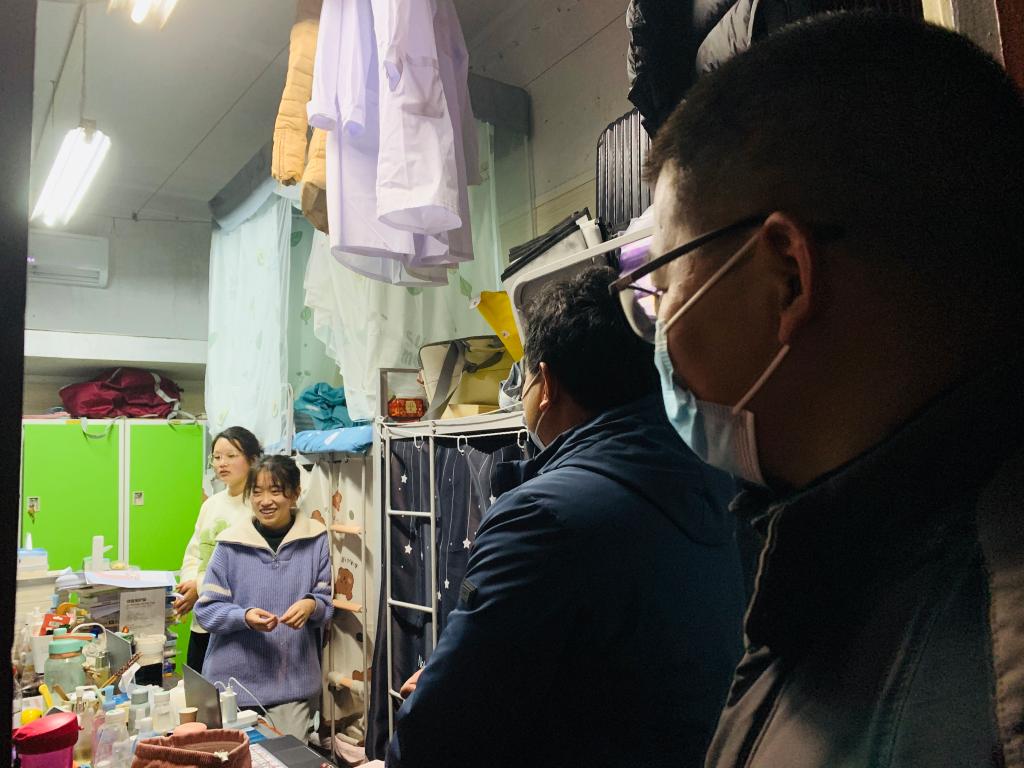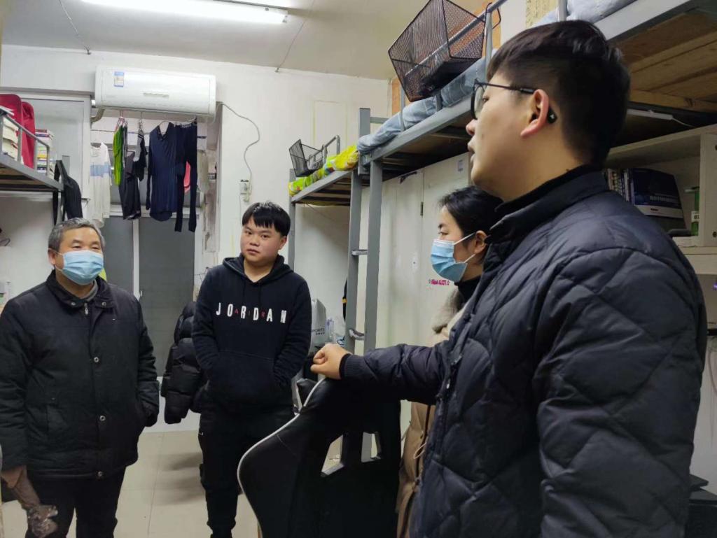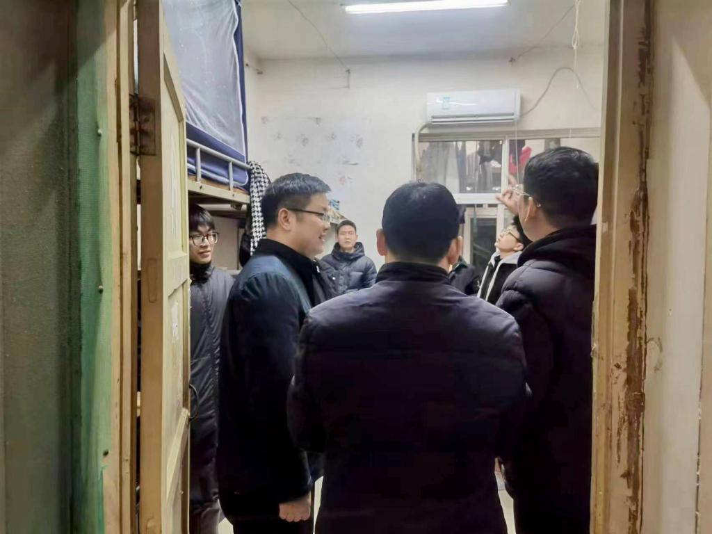 2月13日晚,党委书记汪连生,院长王锋,副院长颜永斌、刘海,党委副书记赵勇,班主任、辅导员等人员到寝室看望学生,关心询问学生学习生活状态,了解学生在考前复习中的问题,表示有问题可随时联系学院老师;叮嘱学生要养成良好卫生习惯,外出佩戴口罩,保持安全距离;勉励毕业年级学生合理设置就业期望、努力把握就业机会,考研学生要做好复试准备,以良好的心态、姿态迎接新学期!